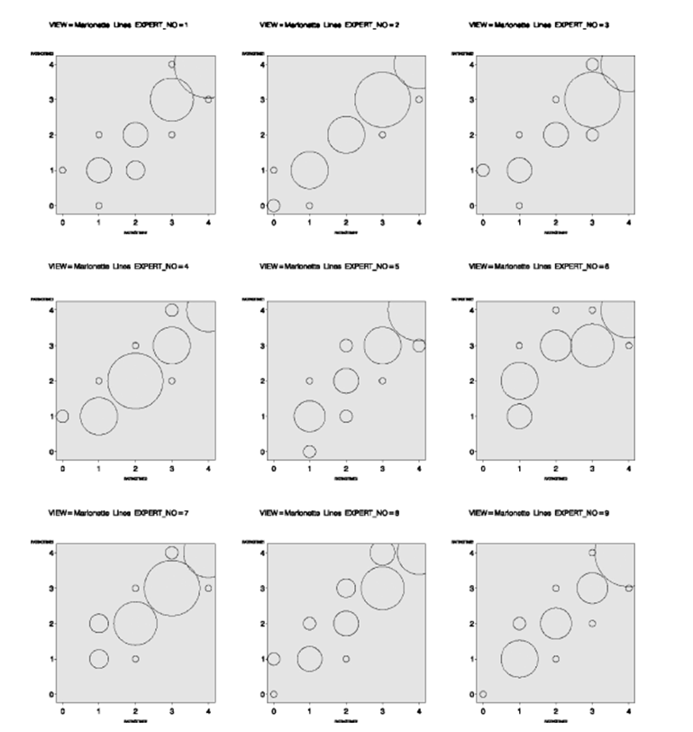 九位美容醫學領域的專家根據真實人物照片(圖1B)中呈現的“木偶線”特征,對35個案例進行了評估,并與經過變形處理的圖像進行了對比。演變圖像顯示了定義的長寬比的階梯式變化。在初始培訓會議和實踐案例的討論之后,每個專家在連續兩天內獨立地對35個案例進行評估。將數據雙重輸入數據庫,并檢查其正確性。