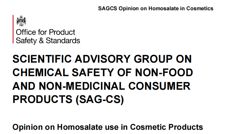 In May, 2025, Scientific Advisory Group of Chemical Safety of Non-food and Non-medicinal Consumer Products (SAG-CS) issued opinion on Homosalate in Cosmetics (Opinion 17).